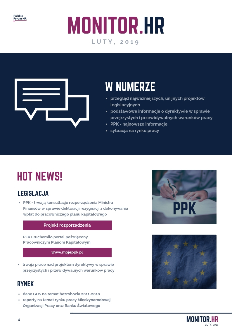 W lutowym wydaniu Monitora HR skupiliśmy się przede wszystkim na przeglądzie najważniejszych, legislacyjnych projektów unijnych. Na szczególną uwagę wszystkich agencji zatrudnienia zasługuje projekt dyrektywy w sprawie przejrzystych i przewidywalnych warunków pracy.