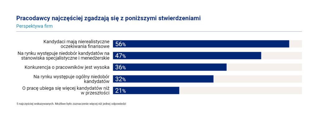Świadczy to o dużej niepewności po stronie firm. Wiele z nich doświadcza sprzecznych sygnałów płynących z rynku pracy. Z jednej strony deklarują, że o pracę ubiega się więcej kandydatek i kandydatów niż w przeszłości (21 proc.), co teoretycznie powinno ułatwić skuteczną rekrutację. Z drugiej natomiast uważają, że na rynku występuje niedobór specjalistów i menedżerów (47 proc.), a 32 proc. – że Polsce doskwiera ogólny niedobór pracowników. Nie dziwi zatem fakt, że jednoznaczne określenie tego, jak będzie wyglądała sytuacja na rynku pracy w roku 2024, przysparza firmom trudności.